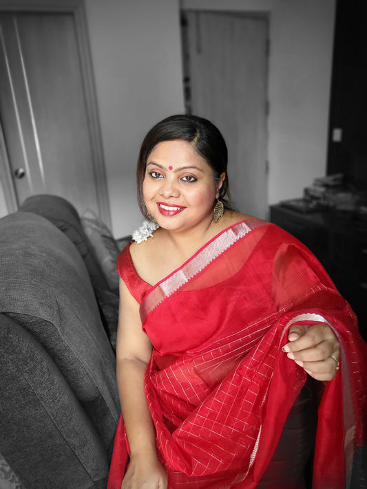 Mangalgiri Red Silk Saree with Silver Zari Checks and Border