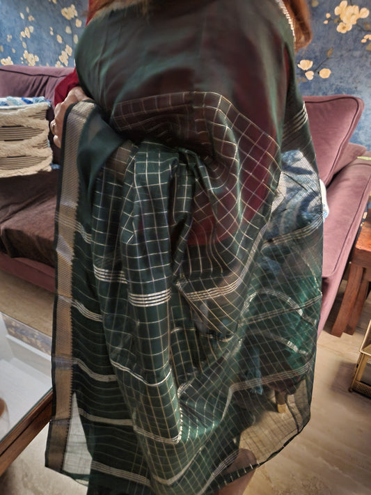 Green Mangalagiri Silk Saree with Silver Zari checks