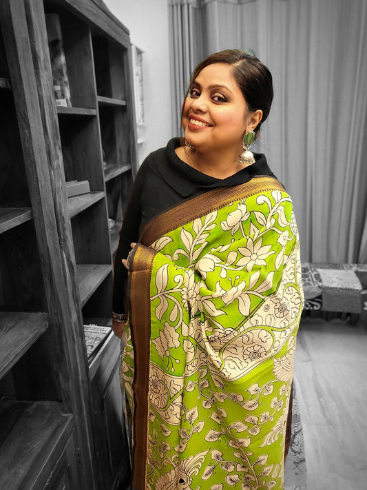 Exquisite Kalamkari Silk Saree in Green with Nizam Border