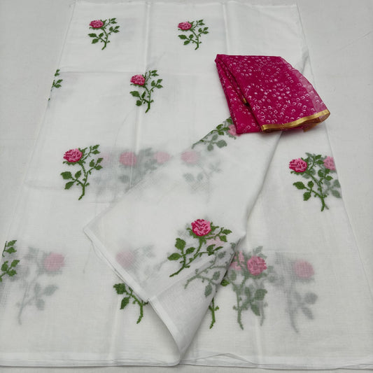 White Kora Cotton Saree with Machine Embroidery